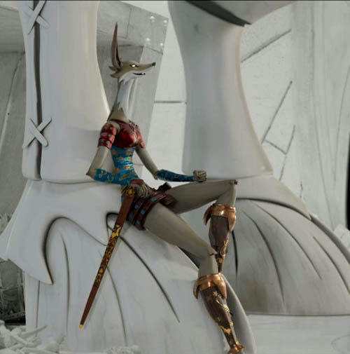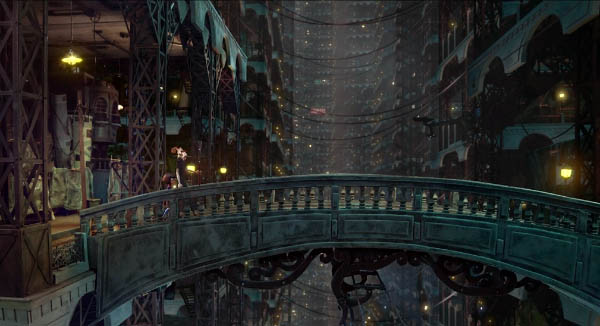 Inside, the world is a sparsely populated, multi-tiered city. There's some kind of time limit before things cease to exist. The characters either want to escape the book, or want Dalia to finish it so that the story won't be stuck anymore. Most of the few characters we meet have their own agendas. Dalia has a guardian there, a cloaked, goggled anthropomorphic goat. Her father had written him into the book as a gift on Dalia's 5th birthday. It was this character who first caught my attention, and was why I tracked down this film. Alas, he's one-dimensional, if very cool-looking!