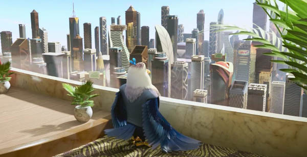 An important-looking eagle contemplates if he's been obviously evil enough yet.Still, the animation is fine, as are the many bird designs. There's a weird irony that birds are operating large, technologically advanced aircraft. And I couldn't help but notice that they built their capital city in a location devoid of convenient natural resources.