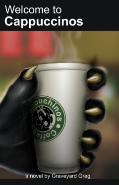 Graveyard Greg explains in his Foreword how he came to write this novel. Firstly, there was the Second Life virtual-reality world, for which he created a jackal persona with a red Mohawk wearing black jeans and red sunglasses. Secondly, there was his brief job as a barista at a Starbucks. Thirdly, there was John “The Gneech” Robey’s series Fictionlets: The Extremely Brief Adventures of Bridgid and Greg, each of 400 words or less. Fourthly, there was his own imagination, which blended them together, named his jackal Venti and gave him a job as a part-time barista at a Starbucks clone, and he was off and running in a series of short-short-short chapters of one page or slightly over each. Voilà; Welcome to Cappuccinos! (exclamation point optional).